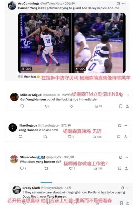 还有美国网友直接爆粗表示:“杨瀚森XX立刻滚出NBA。”